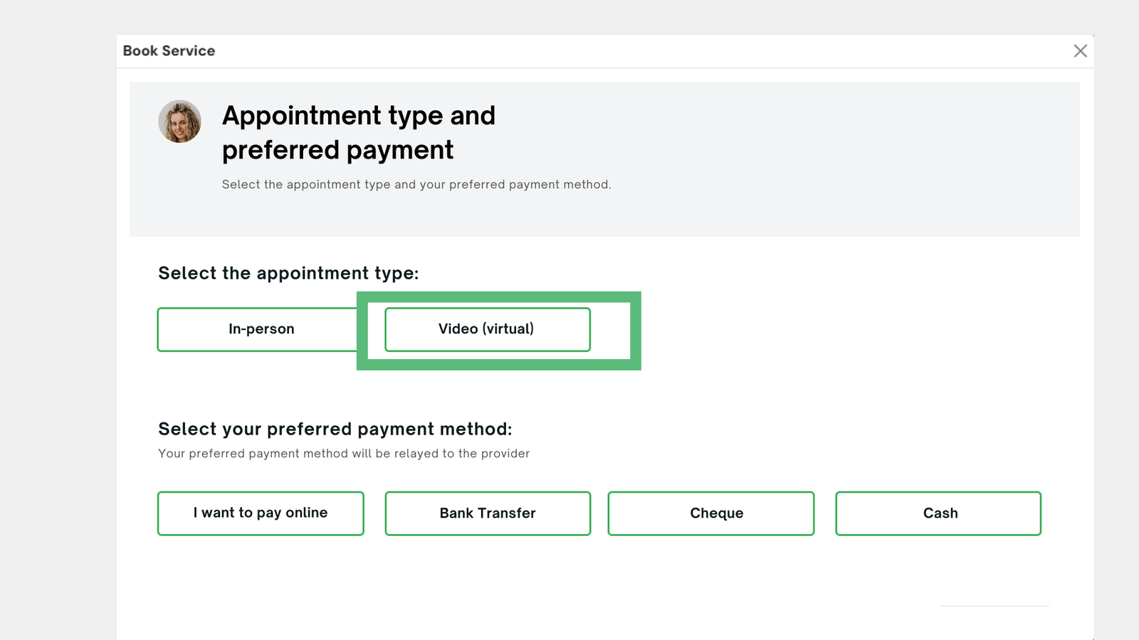 You can schedule a virtual appointment on Materia+ in the same way you would for an in-person appointment. Choose the service you want to book, select a date and time from the available slots, and proceed through the booking process. At some point, you will be prompted to choose whether the appointment will be in-person or virtual. Select the virtual option and finalize your booking.