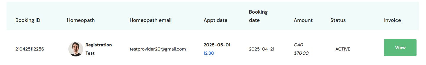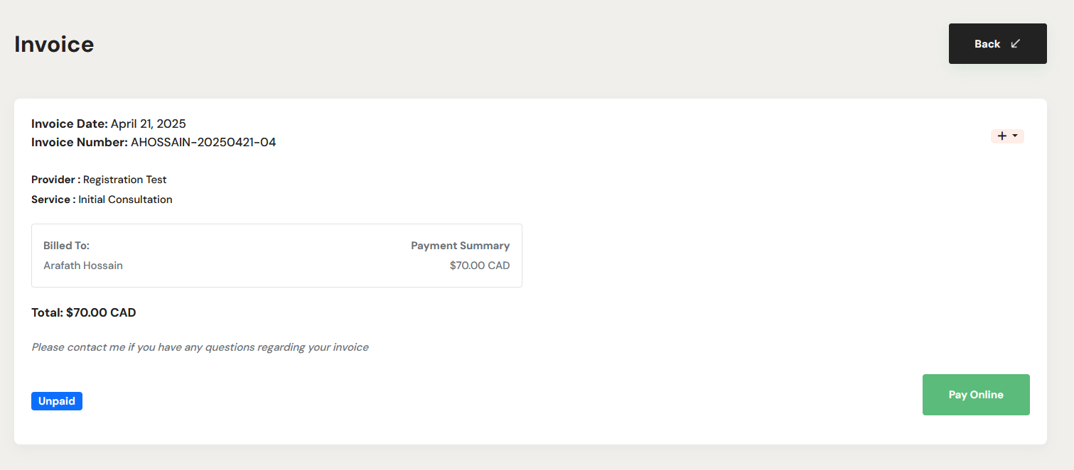 Once an appointment is booked, you and the patient will receive an automatically generated invoice in your dashboards. This invoice will initially be marked as "unpaid."