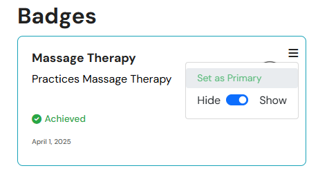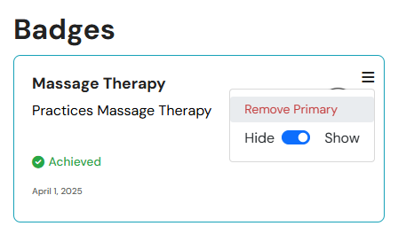 The badges and accolades displayed on your card are marked as "Primary." To assign or remove the "Primary" status of a badge or accolade, visit the Badges & Accolades page, locate the desired badge or accolade, open its menu, and select Set As Primary or Remove Primary.