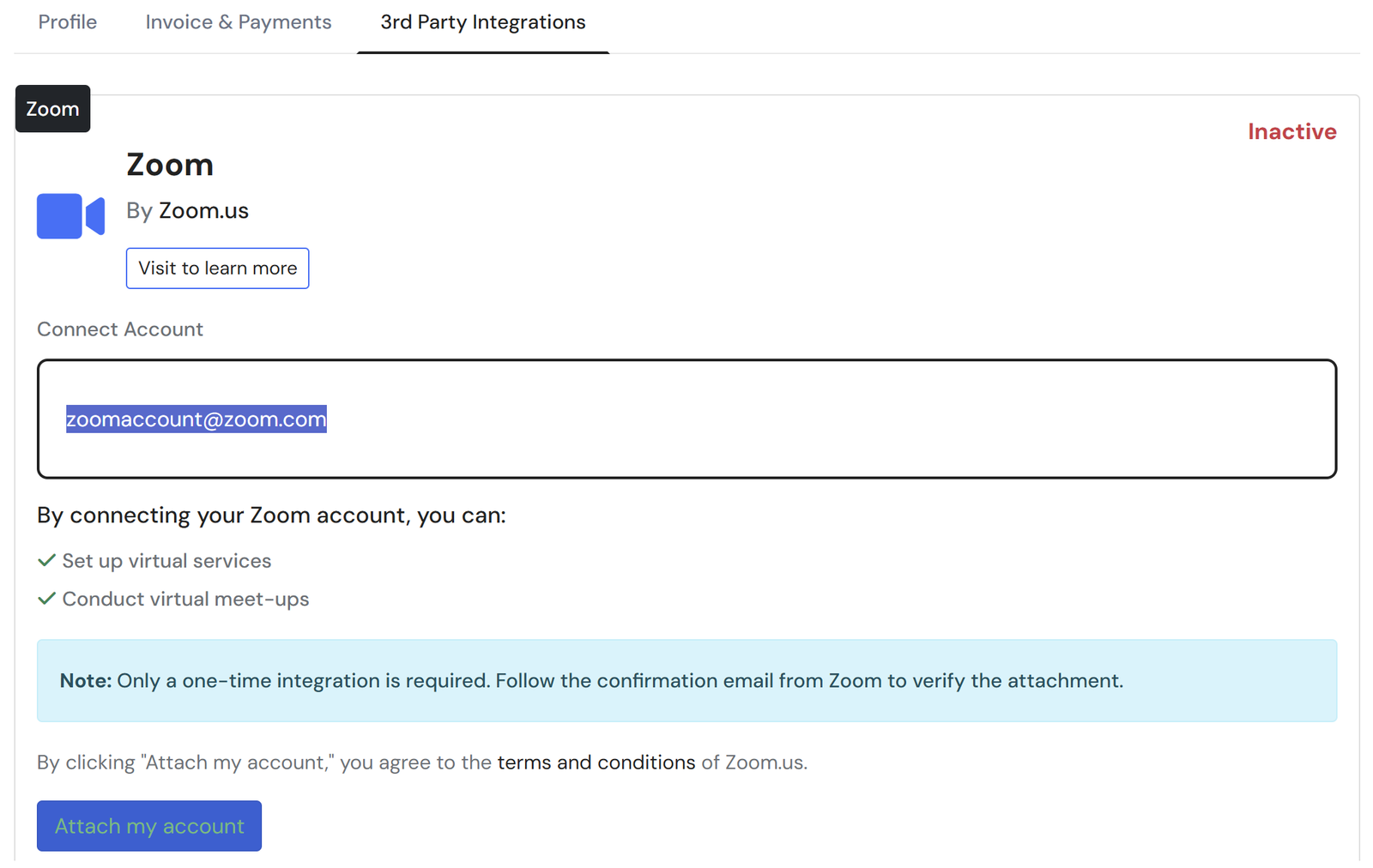 To start providing virtual appointments, you'll need a Zoom account. If you don’t have one, you can easily create one here. After setting up your Zoom account, go to Settings > 3rd Party Integrations. Enter your email in the provided field and click "Attach account."