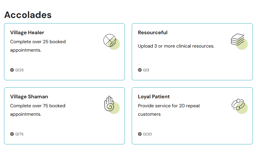 As providers engage with and develop their presence on the Materia+, they will reach specific milestones known as accolades. These will be showcased on each provider's client portal.