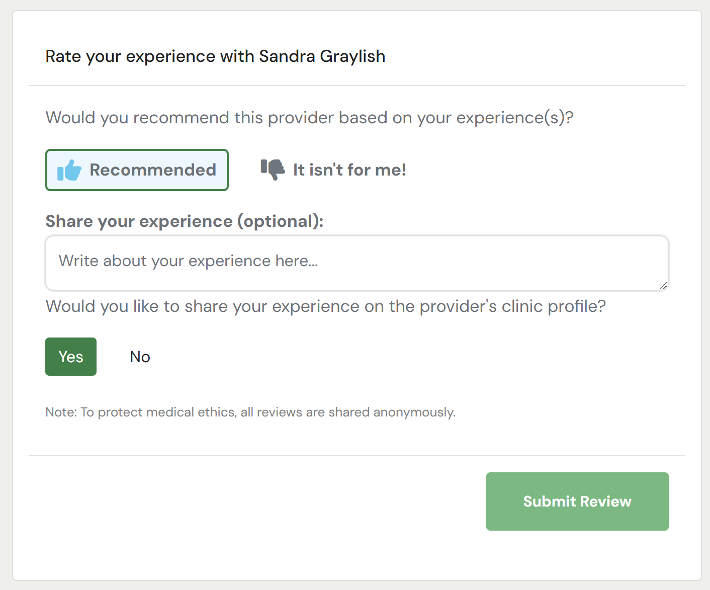 Providers who are not comfortable with review systems have the option to conceal all patient experiences from their profile. However, this choice means that your patients and visitors to your profile will be unable to view any patient feedback. This will also hide the total number of recommendations you have received.